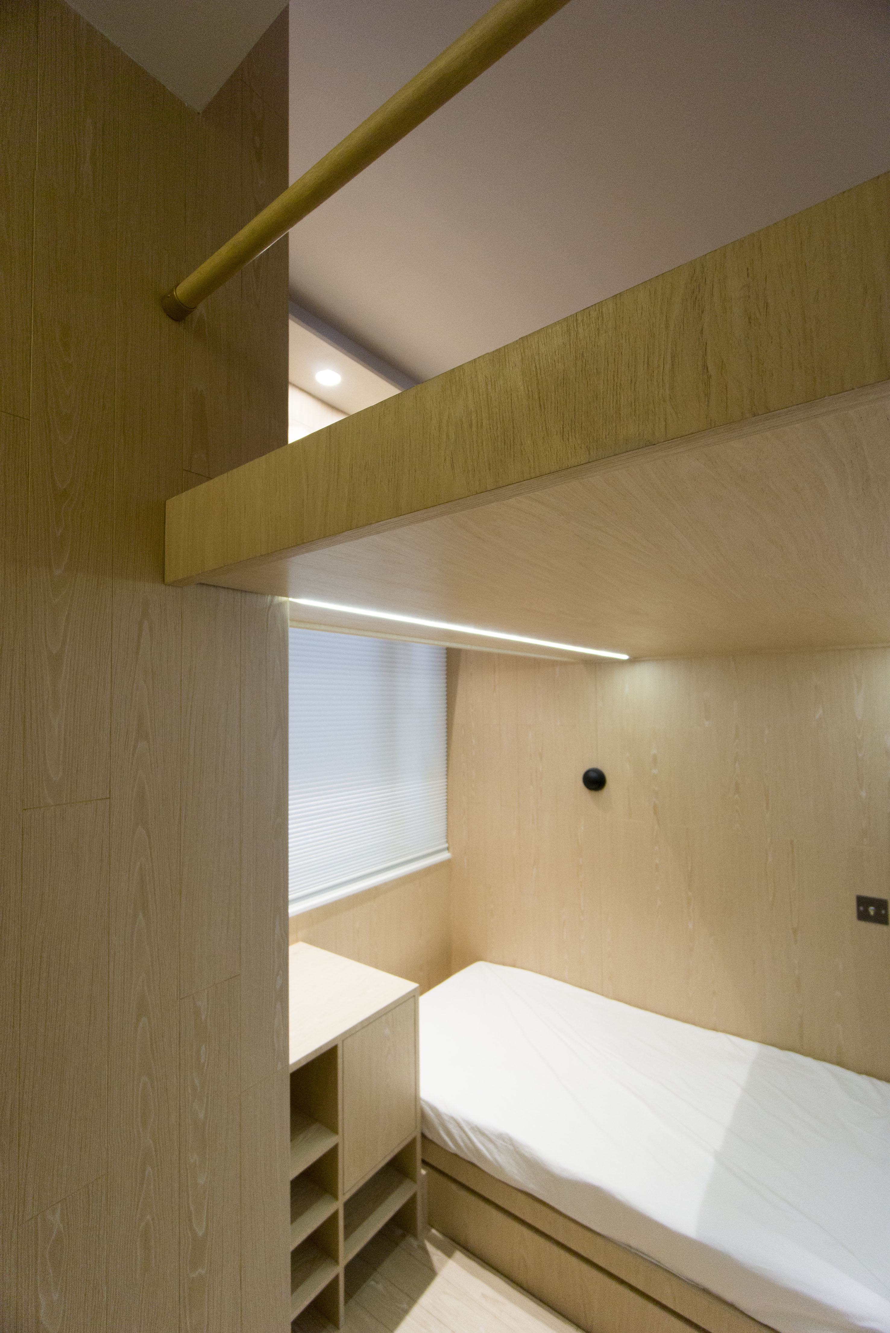 項目中整體環境均以不同形式的白材及原色作主導﹐ 而小女兒的卧室獨以木材舖砌﹐並在半層空間的間牆上打開了一扇與主空間交流的圓窗﹐營造成霧間的一所小樹屋﹐增添寧靜而溫暖的趣味感。家裡的主生活空間、備餐區域、通廊及卧室等都避免以常規性實體分隔﹐而是運用空間線條、形態、構件色彩及材質去區分、融合﹐同時以內窗、拱門及織物等去揭露貫穿視覺的元素﹐ 加強空間協調及人物互動。