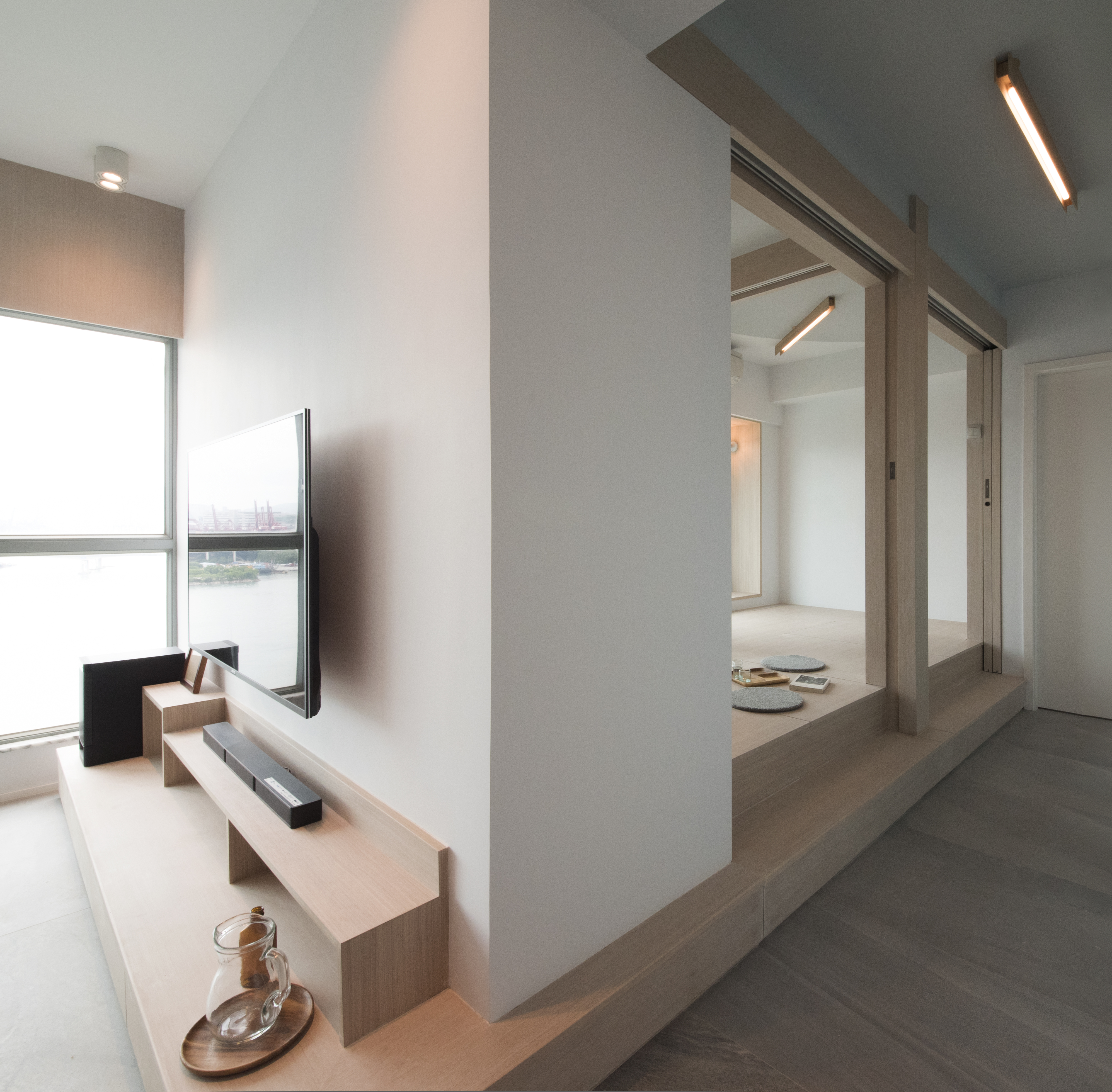 The journey of the apartment begins with a delightful entrance with pixelated tiles within a wooden structure, leading towards the main living space of an oceanic view. A small tea house is sitting calmly behind the joyful area, allowing a couple and their newly-born to mingle and imagine besides the beautiful scene of the Rambler Channel.